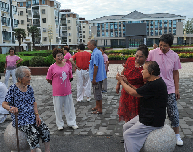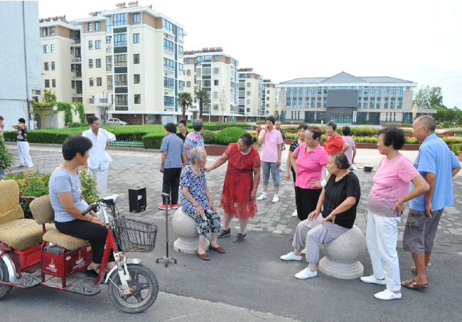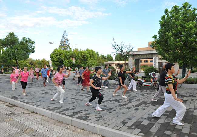 “我母親早晨起來就要叫我?guī)鰜砜纯矗蠹姨瑁魄妻r(nóng)場風(fēng)景,感受下清晨涼爽的空氣。”昨天一早,淮海農(nóng)場群樂小區(qū)的百歲老人張瑞瑞照例又坐著女兒的電瓶車,來到農(nóng)場文化廣場上看風(fēng)景,只見她一走下電瓶車,就徑直坐到打太極拳隊(duì)伍旁的球蹲前,靜靜地看著大家,那神情,仿佛就是一名忠實(shí)的觀眾,欣賞著太極隊(duì)員們表演的節(jié)目。