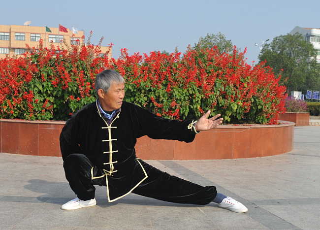 兒子的鼓勵,教練會長的耐心勸導和眾多太極好友的大力支持,從此也讓林耀國克服了自卑的心理,增強了學練太極的信心。他不但天天早上第一個到現場,找先來的陪著他練太極,晨練結束后,還留下來請教練對他補課,糾正動作,講解運拳舞劍道理。回家后他也是對著鏡子堅持學練,特別是對高難度動作反復操練,細心琢磨每個動作的規范要領,真正做到了拳不離手,訣不離口。功夫不負有心人,對一個上了歲數的老人,也這樣的磨練,他從不會到會,從會到比較熟練,僅過了幾個月的時間,基本上能把楊式太極拳24-48式、太極劍32-42式很流暢地用動作展示出來,現在的他已經是太極協會里的主力隊員了。