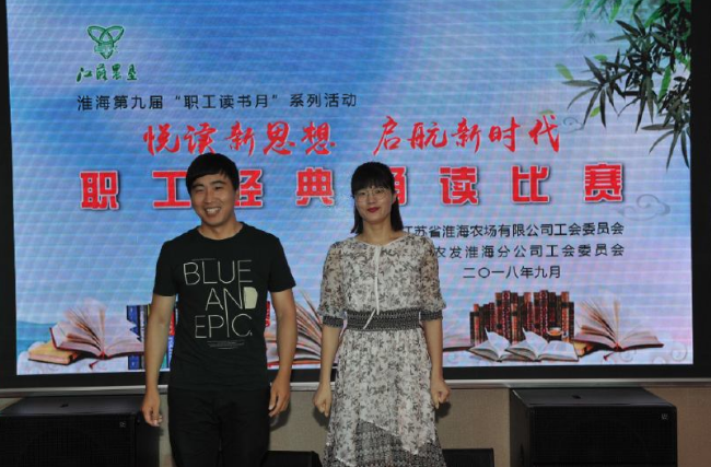 9月4日下午,在淮海工會舉辦“悅讀新思想 啟航新時代”職工經典誦讀比賽上,來自二分場社區代表隊的任超龍和機關代表隊的欒艷彥在與來自淮海基層16個單位選手的比賽中,雙雙獲得經典誦讀二等獎。當他們夫妻攜手登臺領獎時,博得了現場60多名觀眾長時間的掌聲。