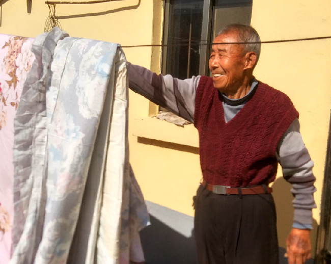 在李朋友家采訪過(guò)程中,李朋友的女兒李月春告訴我,她父親也是一個(gè)非常愛(ài)干凈的人,不但家里家外收拾的清清爽爽。只要晴天,天天把被子抱出來(lái)曬,并且一直堅(jiān)持自己的衣服自己洗,從不要兒女摻和。就是睡的被褥自己來(lái)勾,換季床鋪也是自己來(lái)開(kāi),樣樣事做得是像模像樣,從來(lái)不要兒媳她們來(lái)搭半點(diǎn)手。沒(méi)事時(shí)常拿著掃帚幫助一旁兒子們開(kāi)的農(nóng)機(jī)修理間打掃衛(wèi)生,就是門前的路上,老人也常拿著掃帚清掃路面,有時(shí)還向兩邊打掃出去有百十米長(zhǎng),讓負(fù)責(zé)這片的環(huán)衛(wèi)工都要感謝他。