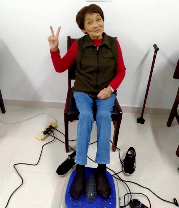 “董爹爹,你快來試試這個足底按摩儀,很舒服哦!”姚奶奶呼喚著老朋友,你一言我一語地交流著體驗感受,于是便留下了姚奶奶比著“耶”,董爹爹豎起大拇指的生動照片。
