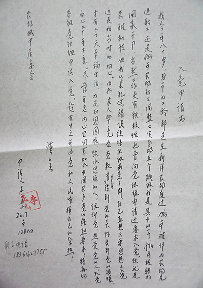 近日,八十一歲的李正山老人再次向新洋城中黨支部遞交了入黨申請書,一封、兩封、三封……一寫就是好幾年,這位耄耋老人的入黨情懷成為廣為傳頌的佳話。