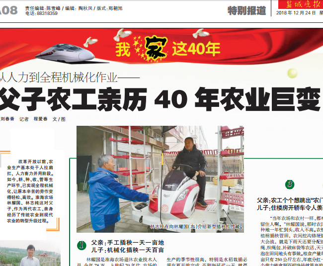 在12月24日出版的鹽城晚報(bào)第8版《我家這40年》欄目上,刊登了一篇淮海農(nóng)場(chǎng)社區(qū)劉春香采寫(xiě)的《從人力到全程機(jī)械化作業(yè)——父子農(nóng)工親歷40年農(nóng)業(yè)巨變》文章,從父親林耀國(guó)和兒子林志純這對(duì)父子的對(duì)話(huà)中,來(lái)實(shí)時(shí)反映改革開(kāi)放四十年來(lái)我國(guó)取得的偉大成就我農(nóng)墾發(fā)生的翻天覆地的變化,讀來(lái)令人印象深刻,并真切地感受到了改革開(kāi)發(fā)以來(lái),發(fā)生在我們身邊的種種變化。以下是全文內(nèi)容。