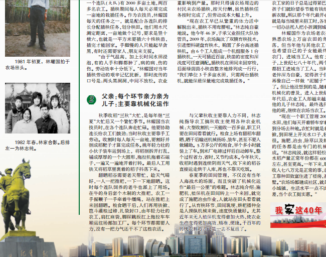 “現(xiàn)在一個(gè)職工管理200多畝水田,他們每天開(kāi)著轎車(chē)穿著皮鞋到分場(chǎng)去種地。農(nóng)忙時(shí)就是拿著鐵锨,到田埂上開(kāi)關(guān)水口子,輕松得很。施肥、治蟲(chóng)、除草以及耕耙播的任務(wù)都是由專(zhuān)門(mén)的機(jī)械來(lái)完成。”林志純說(shuō),就這樣輕松上班,水稻產(chǎn)量正常年份都在600公斤左右,甚至更高。一年下來(lái),職工的收入七八萬(wàn)元是正常的事,農(nóng)場(chǎng)職工靠種田致富住進(jìn)了樓房,甚至別墅。“農(nóng)場(chǎng)場(chǎng)部建成社區(qū),就是一個(gè)小城鎮(zhèn),生活水平一點(diǎn)不比城里差,當(dāng)個(gè)農(nóng)工挺實(shí)惠。”圖為刊登《我家這40年》人物稿報(bào)紙和林耀國(guó)父子在插秧機(jī)上感受新型農(nóng)機(jī)時(shí)的鏡頭。