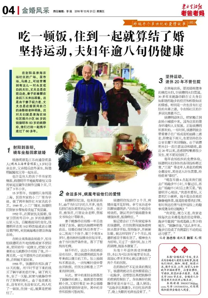 在12月21日出版的東方生活報(bào)第4版《跨越半個(gè)多世紀(jì)的愛(ài)情故事》專欄上,刊登了一篇淮海農(nóng)場(chǎng)宣傳科科長(zhǎng)陸軍采寫(xiě)的《吃一頓飯,住到一起就算結(jié)了婚 堅(jiān)持運(yùn)到,夫婦年逾八旬仍健康》的文章。從錢(qián)德明和姚靜珍結(jié)婚寫(xiě)起,到婚后相濡以沫的生活,再到老人如今通過(guò)堅(jiān)持鍛煉,保持健康的體魄為中心來(lái)寫(xiě)。文章讀后令人感動(dòng)。自去年陸軍開(kāi)始寫(xiě)金婚故事以來(lái),已在報(bào)上刊登了 9篇金婚故事和 7篇整版人物專稿。以下是全文內(nèi)容。