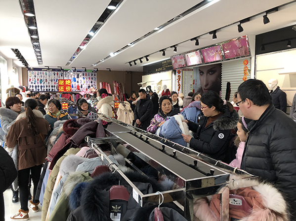 現場,顧客們進出于沿街服裝店面,挑選自己喜愛的羽絨服。營業員掛著笑容不厭其煩地向顧客介紹新款新品羽絨服,顧客朋友們穿走的是溫暖,帶走的是放心。