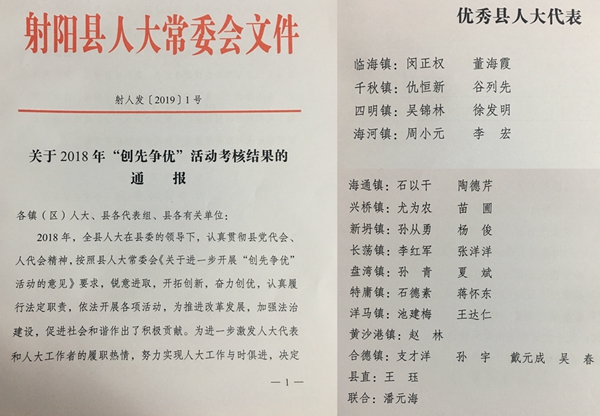 據(jù)射陽(yáng)縣人大常委會(huì)文件射人發(fā)[2019]1號(hào)《關(guān)于2018年“創(chuàng)先爭(zhēng)優(yōu)”活動(dòng)考核結(jié)果的通報(bào)》獲悉,新洋農(nóng)場(chǎng)有限公司董事長(zhǎng)、總經(jīng)理潘元海獲“優(yōu)秀縣人大代表”榮譽(yù)稱號(hào)。