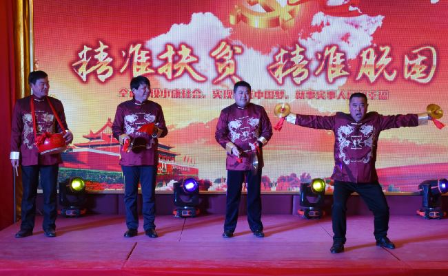 下場(chǎng):咚咚咚咚嗆、咚咚咚咚嗆、咚咚咚咚嗆嗆、咚咚咚咚嗆(圖為團(tuán)拜會(huì)上精準(zhǔn)扶貧政策好三句半劇照。)