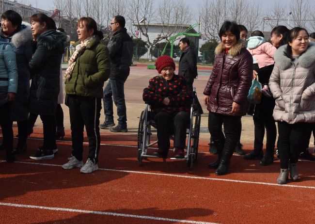張瑞瑞老人在現場端坐在輪椅上,饒有興趣地觀看職工居民們熱衷地參加表演,遇到開心處,還拉拉女兒的手,說著話。從老人目前的狀態中,我們發現老人的視力很好,精神也不錯,看得出老人在現場笑著也很是開心。