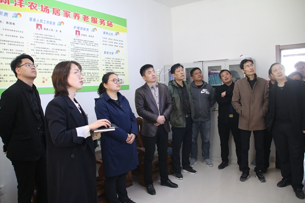 途中,戴學林簡要介紹了新洋經(jīng)濟社會基本概況,重點就產(chǎn)業(yè)發(fā)展、社會職能改革、資產(chǎn)資源盤活利用、社區(qū)創(chuàng)新管理、企業(yè)文化建設等進行介紹。他說,近年來,新洋不斷深化改革,以改革促發(fā)展,加強農(nóng)業(yè)高效精細化管理,挖掘林苗木生產(chǎn)潛力,盤活存量資產(chǎn),使“死資產(chǎn)”變成“活資源”,經(jīng)濟發(fā)展呈現(xiàn)良好勢頭。根據(jù)社會職能改革要求,圍繞“內(nèi)部分開、管辦分離、授權(quán)委托、購買服務”十六字方針,積極穩(wěn)妥推進社會職能改革,進展順利。新洋連續(xù)26年蟬聯(lián)省級文明單位稱號,緊緊抓住江蘇農(nóng)墾新時代文明實踐中心建設試點的機遇,結(jié)合傳統(tǒng)文化建設成果,以愛心超市為載體,志愿者服務為特色,將新時代文明實踐、文明單位創(chuàng)建與精準幫扶、家政服務、居民素質(zhì)提升相結(jié)合,大力開展大愛新洋創(chuàng)建活動,弘揚真善美,提高居民幸福指數(shù),不斷豐富大愛文化內(nèi)涵。同時,以居家養(yǎng)老服務中心為依托,引進智能化管理系統(tǒng),積極探索和滿足老年服務的深層需求,不斷豐富老年服務內(nèi)容,積極應對場域老齡化現(xiàn)狀,踐行尊老愛老敬老的良好風尚。