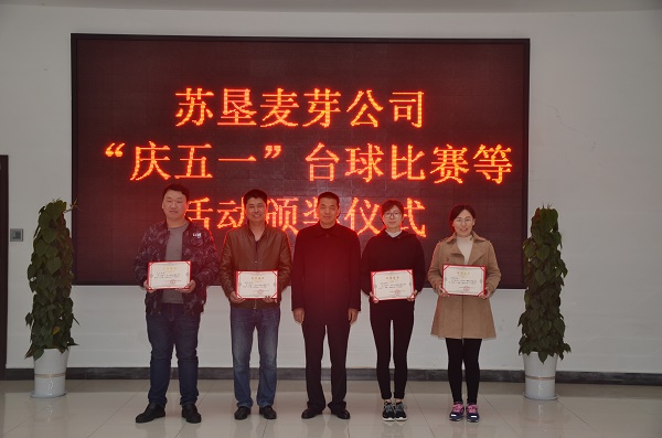 4月29日下午,蘇墾麥芽公司舉辦“慶五一”臺球比賽等活動,公司各部門共計70余名員工參加了比賽,公司經營層領導參加了此次活動并為獲獎選手頒發證書。