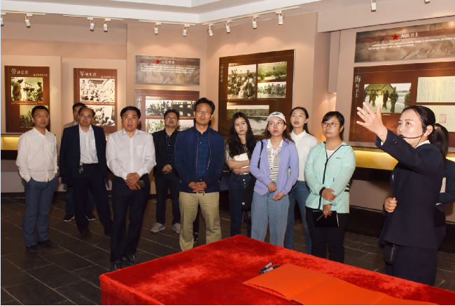 隨后,采訪組一行依次來到農(nóng)建四師紀(jì)念碑,農(nóng)建四師暨淮海農(nóng)場歷史陳列館等處參觀。農(nóng)場公司領(lǐng)導(dǎo)和陳列館講解員詳細(xì)地向新聞媒體采訪組一行介紹了軍墾傳統(tǒng)文化在淮海的起源、發(fā)展和傳承情況。農(nóng)建四師紀(jì)念碑的雕像含義,毛澤東主席頒布生產(chǎn)待命、建設(shè)農(nóng)場命令的前后經(jīng)歷,一萬名農(nóng)建四師指戰(zhàn)員從海門三倉鎮(zhèn)來淮海農(nóng)場進(jìn)行千里行軍、百里連營、“三大戰(zhàn)役”等艱苦卓絕的生產(chǎn)場景,這些都引起新聞單位記者們的濃厚興趣。館內(nèi)珍藏的每一件斑駁的物件、每一幅珍貴的歷史圖片、每一尊形象的雕塑和生產(chǎn)情況的介紹短片,讓參觀采訪的記者們對軍墾傳統(tǒng)文化感受到了強(qiáng)烈地震撼,無不對先輩們創(chuàng)建的“艱苦創(chuàng)業(yè),不怕困難,團(tuán)結(jié)奮斗,無私奉獻(xiàn)”的農(nóng)建四師精神而敬仰,更為他們“奉獻(xiàn)青春獻(xiàn)終身,獻(xiàn)了終身獻(xiàn)兒孫”的革命英雄主義和樂觀主義而折服。