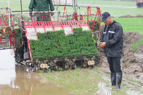 雨下個不停,但絲毫不影響田間秧苗栽插進度。在第七生產區南匡15號田間,協管員林正興沿著田埂緊跟高速插秧機而行,只見他趟到田間拔出一穴秧苗數了下,然后叫停插秧機進行調整。“稍微有點密了,需要調整一下。”“這是最后一塊田,今天可以結束。”林正興向生產區許主任匯報著插秧進度,由他負責的21連三夏生產首戰告捷,在全公司率先完成栽插任務。