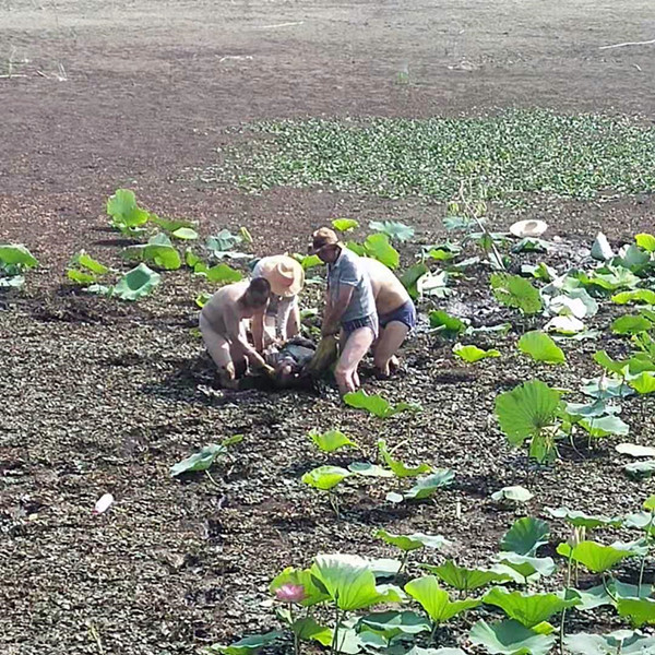 由于近期持續干旱無雨導致洪澤湖水位急劇下降,為了保證水稻秧田夏管用水,7月25日上午,三河分公司領導組織分公司總經理助理金見國、農水中心彭中進、第一、第二生產區負責人屈連成、李孝剛、分公司副總農藝師賈后如一行六人前往三河農水中心彭中進、第一、第二生產區主任屈連成、李孝剛、工程施工負責人孫樹華一行六人前往新豐站勘查引水現場。當行至新豐站一千米左右時,發現離岸邊幾十米的荷花蕩內有一人站在淤泥里,他們原以為是在采蓮藕,便開玩笑的說,藕好不好吃啊?這時候,那人抬了一下頭微弱的說了一句,“快點、我要死了”,說完這句話,那人便一頭栽倒在淤泥里,不好,那人肯定是陷進淤泥上不來了,說時遲,那時快,李孝剛、孫樹華迅速跳進淤泥,向那人艱難的䠀去,隨即分公司總經理助理金見國、農業中心主任賈后如也迅速跳入淤泥中,四個力合力用采摘蓮子的袋子將那人兜住,拼命的往上拖。而這時在岸邊的屈連成、彭中進正焦急的打110和120,當得知陷在淤泥里的是位七十多歲的老人并已經中度昏迷時,心想,不行,等120趕到就來不及了,趕緊聯系農場醫院就近進行搶救,一場與時間賽跑的“搶救戰”在洪澤湖邊大堤上上演。老人救上岸后由于嚴重脫水一直昏迷不醒,分公司總經理助理金見國迅速組織大家給老人脫去滿是淤泥的衣服和鞋子給老人散熱、喂水,農場醫院接到求救的電話后,迅速派出醫護人員攜帶著急救藥品往出事地點趕去,由于通往老人出事的地點車輛無法駛入,護士嚴夢怡下車后一路“狂奔”以最快的速度沖向洪澤湖邊,到跑到老人出事地點時,護士服已經全部濕透了,顧不得喘口氣,迅速給老人進行輸液急救,當120救護車趕到時,老人已恢復意識并清醒。