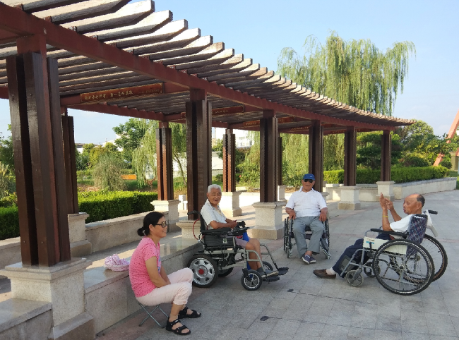 自由徜徉在天地之間,是每一個人的夢想,更是一個坐著殘疾輪椅人的夢想。8月2日下午,我們在淮海公園中看到,三個坐在輪椅上的老人,他們一會兒悠哉哉地在淮海公園的長廊下乘涼聊天,一會兒大家又在公園的小道上推著輪椅運動,看到他們欣喜游玩的鏡頭,仿佛也讓我看到了他們享受在公園里游玩帶來的樂趣,并暢享著健身和生活的美好。