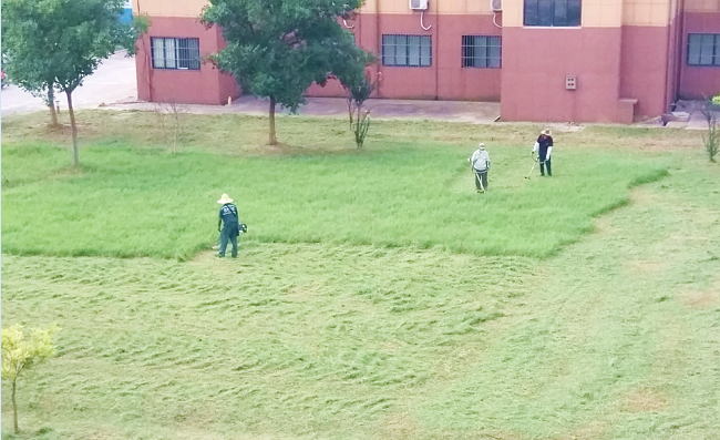 十幾公斤重的剪草機(jī)背上一會(huì)兒還可以,如果在烈日下連續(xù)背上幾十分鐘,而且還要帶動(dòng)連桿一頭懸空的剪草機(jī)頭,來(lái)回左右地掃動(dòng)的草的基部,那工作的勞累程度可想而知。特別是修剪草坪還是在烈日下,絲毫沒(méi)有蔭涼可乘,一個(gè)個(gè)修剪草坪的師傅黝黑的臉龐上們滿頭大汗,他們那布滿草屑的衣背上濕了一大片,從中可見(jiàn)他們辛苦的程度。他們的前方是竄高并雜亂的雜草,身后猶如一個(gè)人剃了頭似的看了干凈清爽。
