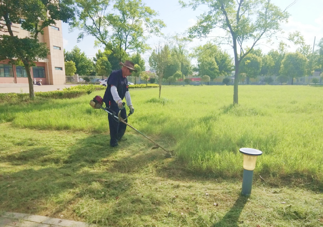 而在農(nóng)場(chǎng)公司公園中、路邊公園里或是小區(qū)、辦公場(chǎng)所里,不時(shí)響起的馬達(dá)轟鳴聲,仿佛在與高溫一起轟鳴。循聲望去,只見(jiàn)三位淮海綠化環(huán)衛(wèi)所的職工正頂著烈日,揮汗如雨地在修剪草坪。