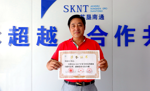 近日,蘇墾南通電力公司員工周新民榮獲國(guó)家衛(wèi)健委、中國(guó)紅十字總會(huì)、中央軍委后勤保障部衛(wèi)生局聯(lián)合頒發(fā)的“2016-2017年度全國(guó)無(wú)償獻(xiàn)血奉獻(xiàn)獎(jiǎng)金獎(jiǎng)”。該獎(jiǎng)是對(duì)獻(xiàn)血8000毫升以上的人士頒發(fā)的國(guó)家級(jí)貢獻(xiàn)獎(jiǎng),是無(wú)償獻(xiàn)血個(gè)人奉獻(xiàn)類(lèi)最高獎(jiǎng)。