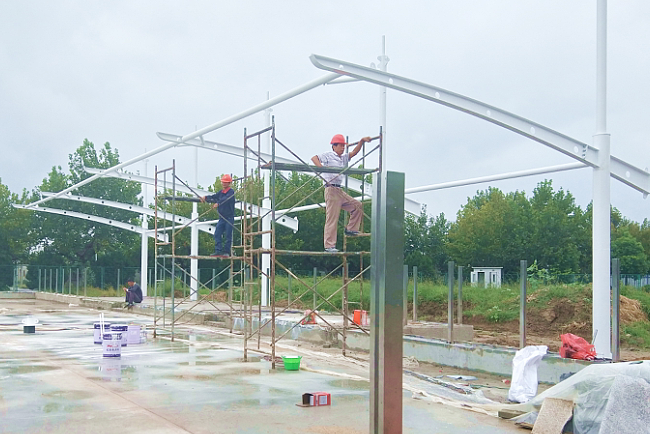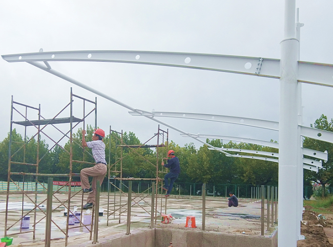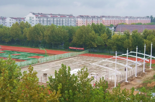 近日,淮海農(nóng)場職工休閑體育運(yùn)動(dòng)廣場在建的門球上,樹起了高大氣派的看臺(tái)鋼架,引起了農(nóng)場社區(qū)職工居民的觀看。這項(xiàng)按國家標(biāo)準(zhǔn)而建、總投資約62萬多元的2個(gè)標(biāo)準(zhǔn)門球場,設(shè)置了看臺(tái)、觀賽休息區(qū)及相關(guān)附屬設(shè)施,根據(jù)計(jì)劃于10月1日前完工并投入使用的門球場,受到了農(nóng)場社區(qū)職工居民尤其是老年朋友的歡迎。
