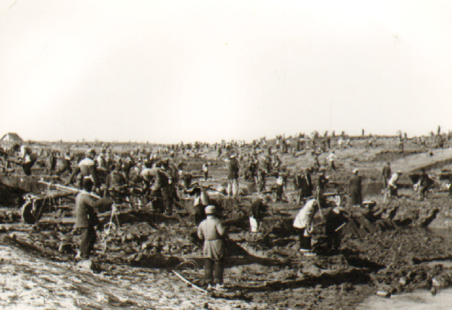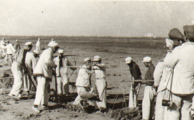 隊(duì)伍出發(fā)了!迎著雨,頂著風(fēng),踏著泥濘的道路奔赴工地,到達(dá)目的地后,同志們立即就在風(fēng)雨中與黃土“開火”!雨越下越大,風(fēng)越刮越兇,每個(gè)同志從頭發(fā)到腳跟都被雨淋濕了,淤泥粘住鍬頭,地下水位很高,挖一塊泥很吃力。雖然,有水車可車水,面盆可戽水,但是溝底的水老是滲出來(lái)!戰(zhàn)士們把淤泥從河底向岸上扔,力氣小的扔得近,又從坡子旁滾回溝里,這些困難嚇不倒英勇的人民戰(zhàn)士。圖為當(dāng)年農(nóng)建四師官兵在水利工地上戰(zhàn)斗的鏡頭。