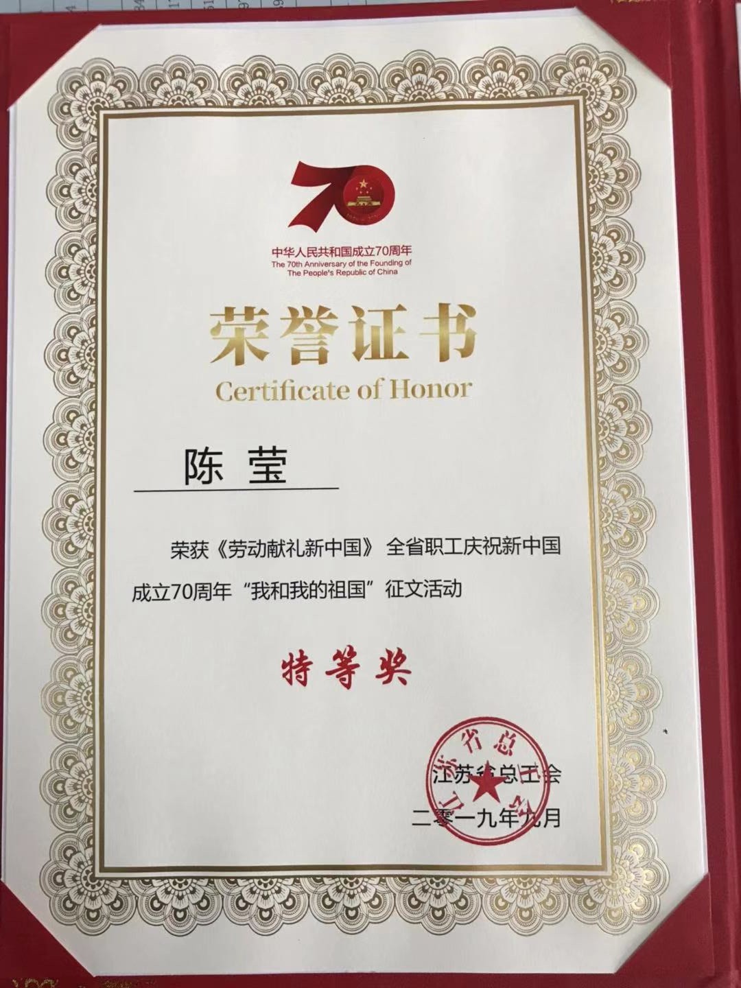 經(jīng)農(nóng)墾物業(yè)公司工會和集團工會推薦,物業(yè)公司職工陳瑩同志以《假如我有一臺時光機》一文參加《勞動獻禮新中國》全省職工慶祝新中國成立70周年“我和我的祖國”征文活動并榮獲特等獎。該活動共收到文稿5204封,特等獎10人,陳瑩代表江蘇農(nóng)墾獲得榮譽。