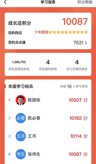 強化定期考核。該公司黨委組織學習強國管理員根據當日參與學習人數、累計積分數進行核實匯總,一天一通報、一周一考核,定期通報“學習強國”學習的整體情況,保證“學習強國”學習善始善終,黨員干部覆蓋率100%。