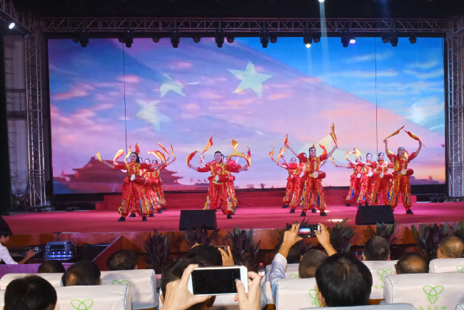 腰鼓《永唱中國夢》因為喜慶和熱烈的節目,特意被主辦方安排在臨海農場有限公司開場舞之后,四名主持人上臺主持走進江蘇農墾“壯麗七十載 奮進新時代”迎國慶文藝演出后的第一個表演的節目,16名參與節目演出的人員由精湛的舞姿、旺盛的精神魅力和富有激情的肢體語言,為整臺迎國慶文藝演出開了個好頭,彰顯了來自淮海文藝體育的風采。