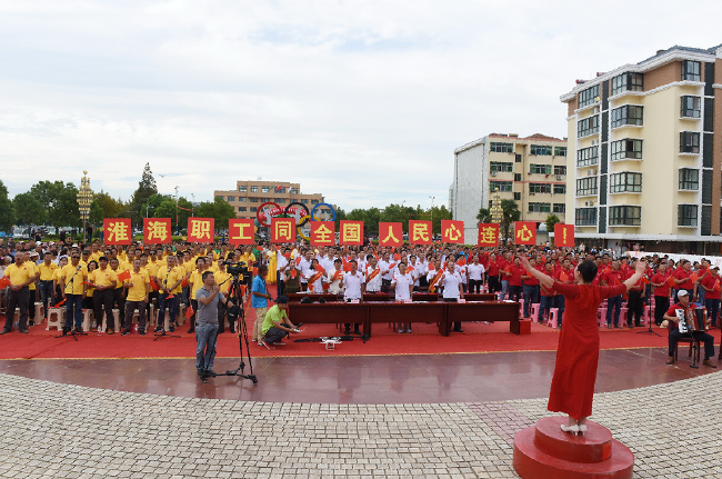 本屆廣場文化節(jié)在舞蹈《幸福舞起來》中拉開了帷幕。《祝福祖國》《唱支山歌給黨聽》《為祖國干杯》等一支支舞蹈,演員們以歡快的舞姿,從心底間來祝福農(nóng)場職工居民蒸蒸日上的新生活;詩朗誦《青春中國》,把共產(chǎn)黨人經(jīng)歷曲折道路上的艱辛,為了目標和希望那不屈不饒的精神,真情地展示在人們的面前;情景劇《十二人抬橋》展示了農(nóng)四師老軍工們面對艱難困苦的條件,保持了艱苦創(chuàng)業(yè)和團結(jié)奮進的英雄氣概,為我們樹立了傳承的榜樣;歌伴舞《人民的好干部——焦裕䘵》,把焦裕䘵以身體力行的姿態(tài)和清正廉潔的作風,演繹得淋漓盡致,反映出共產(chǎn)黨人時刻把人民的利益放在首位,踐行著為了人民的錚錚誓言。愛國歌曲《沒有共產(chǎn)黨就沒有新中國》《愛我中華》《我們走在大路上》《我和我的祖國》在四個不同顏色服裝的方陣中一波接著一波地傳唱,揮舞著五星紅旗的方陣,場面氣勢恢宏。最后由335人組成的五個方陣同聲演唱《歌唱祖國》,把文化節(jié)活動推向了高潮,特別是演唱席中豎起的“熱烈慶祝新中國成立70周年!”和“淮海職工同全國人民心連心!”紅底黃字的標語,讓大家心潮澎湃,激情滿懷。