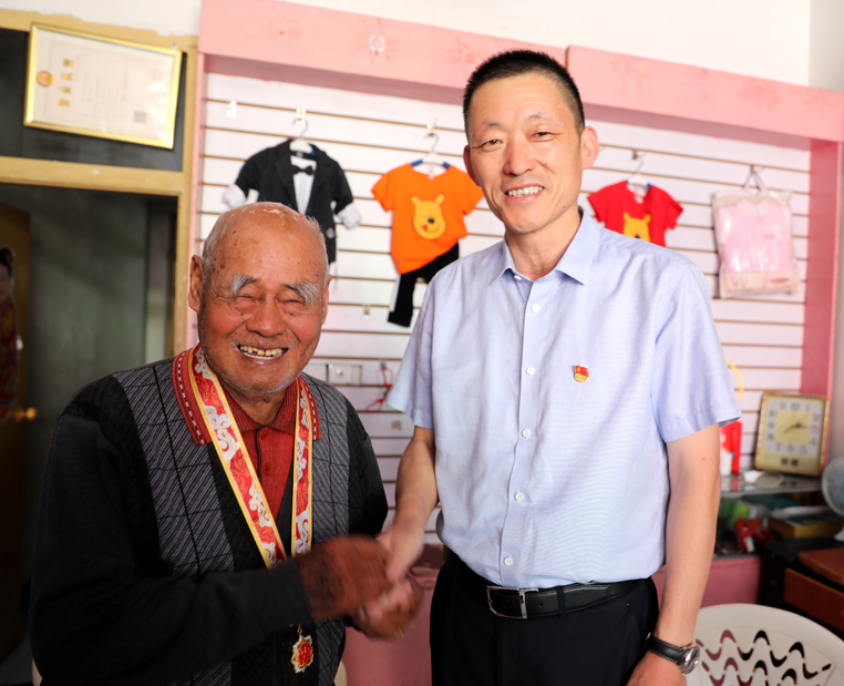 黃海農場公司黨委書記賀在銳到離休老干部涂建華、約田家中看望他們,向老同志致以節日問候,為他們佩戴上“慶祝中華人民共和國成立70周年”紀念章,由衷感謝他們在不同歷史時期為黨和人民,為黃海經濟社會發展作出的貢獻,并與他們親切交談,詳細了解老同志的生活起居和健康情況,囑咐老人要保重身體,祝福老人健康長壽。