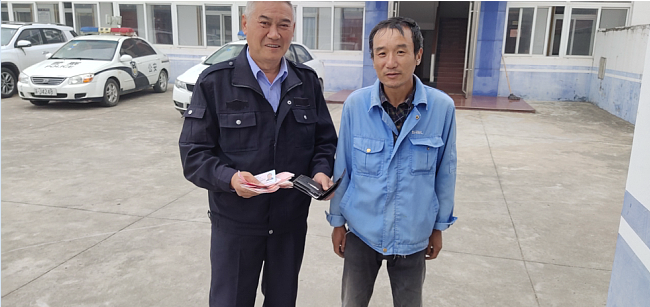 “早上打掃馬路時,在社區旁的廁所前撿到一個黑色錢包,打開一看,里邊有一沓現金和銀行卡。”姜兆華敘說著當時的情況,“我想天剛蒙蒙亮,派出所還沒有上班,周圍也看不到人,他就繼續沿著路途清掃包干區的路面。等我所有路段的工作完成后,就來到派出所來求助尋找失主。”