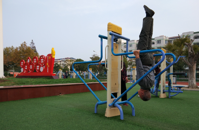 運動健身事業(yè)的發(fā)展,讓一個只有7000多人口的淮海,現(xiàn)有2位百歲老人、75位90到99周歲的老人,673位80到近90周歲年齡段的老人,長壽之場業(yè)已成為淮海的“新名片”。“我運動、我健康、我快樂”的健康運動氛圍,正融入淮海人向往的美好生活。圖為位于淮海文化廣場上的奧林匹克標志雕塑、公園在的太極拳隊伍和一位近90歲的老人在雙杠上練倒立時的鏡頭。