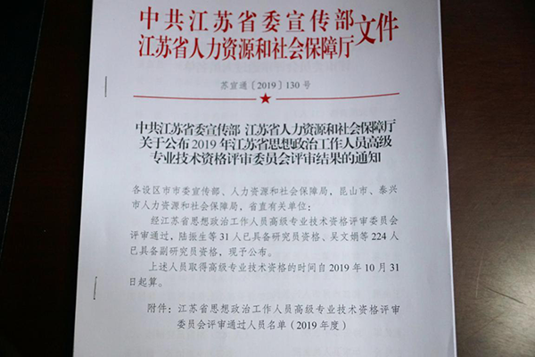 近日,中共江蘇省委宣傳部、江蘇省人力資源和社會保障廳發文,在2019年度江蘇省思想政治工作人員高級專業技術資格評審中,31人獲研究員資格,224人獲副研究員資格。江蘇農墾系統四人獲得副研究員資格,分別是海安農場有限公司崔靜波、南通有限公司薛忠、江心沙農場有限公司嚴建文和新洋農場有限公司陳必春。