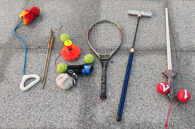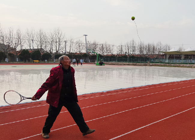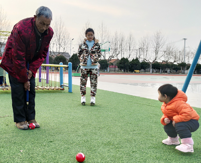 在與范爹的聊天中得知,老人從青年時(shí)代就喜歡健身運(yùn)動(dòng),遇到什么好玩的、有刺激的他都想上手試試,多年來的運(yùn)動(dòng)生涯,讓他擁有了一幅好體質(zhì),雖說已經(jīng)是85歲的老人了,但他眼不花、耳不聾,而且頭腦思維敏捷,走路運(yùn)動(dòng)有勁,就是家里家外也忙得是井井有條。他現(xiàn)在每天早上6點(diǎn)多鐘,范爹就拖著手提包式的拉車,連同他的健身工具一起來到廣場(chǎng)上健身,他先是與農(nóng)場(chǎng)太極隊(duì)友們一起打打太極拳、舞舞太極劍后,就甩起半小時(shí)心愛的空竹。然后就與大家一起在門球場(chǎng)上打門球,在切磋技藝中,享受著健身的美好。