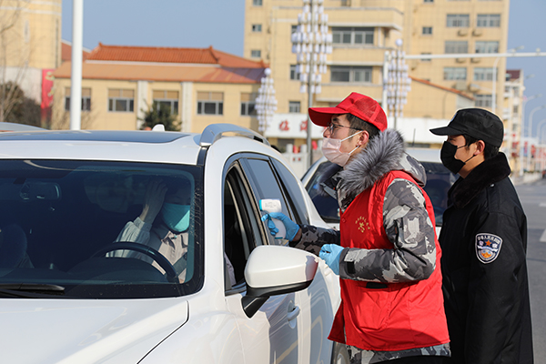 “您好!你們是從哪里過來的,請配合量一下體溫。”“出行一定要戴口罩......”在交通道口,黨員志愿者正在仔細地登記著來往車輛和人員信息,耐心地進行防控宣傳,精心地為車上人員測量體溫。