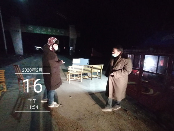 2月16日夜11:46分,在農(nóng)場(chǎng)西大門(mén)防控點(diǎn),上半夜班與下半班夜正式交接,當(dāng)晚值零點(diǎn)至早晨六點(diǎn)班的是修士超、陳桂華、王清如,當(dāng)筆者到達(dá)西大門(mén)時(shí),他們剛剛交接完畢,遠(yuǎn)遠(yuǎn)的寒風(fēng)中,他們穿著軍大衣,深夜的寒風(fēng)吹的讓人瑟瑟發(fā)抖,筆者站在冷冷的寒風(fēng)中,不到十分鐘便不停的哆嗦,何況,他們要堅(jiān)守到天亮。在臨時(shí)搭建的帳篷里,一張長(zhǎng)椅、一箱泡面、一瓶開(kāi)水便是他們漫漫長(zhǎng)夜堅(jiān)守防控點(diǎn)的“后援”,為了三河的平安,他們借助香煙趕走困意和不時(shí)想合起來(lái)的雙眼,守好西大門(mén)是他們心中堅(jiān)定不變的信念。