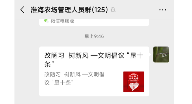 我們在淮海的多種網(wǎng)絡(luò)平臺上看到,《改陋習 樹新風 文明倡議“墾十條”》首先在淮海農(nóng)場有限公司的企業(yè)微信平臺、淮海首期太極拳培訓班微信群上,由農(nóng)場公司黨委書記單祥忠進行轉(zhuǎn)發(fā),隨即此條我承諾倡議書迅速在淮海農(nóng)場管理人員微信工作群、疫情防控群、各居委會工作群中多種平臺進行轉(zhuǎn)發(fā),有的還把《改陋習 樹新風 文明倡議“墾十條”》的內(nèi)容制作成了百家號進行網(wǎng)絡(luò)推介,農(nóng)場公司的職工居民更是以擴散轉(zhuǎn)發(fā)的形式,提升此份我承諾倡議書的影響力,從而有力地撐起了江蘇農(nóng)墾廣大干群齊心協(xié)力,精準施策,合力構(gòu)筑起了抗擊疫情的有效防線的信心和決心。圖為《改陋習 樹新風 文明倡議“墾十條”》內(nèi)容在網(wǎng)絡(luò)上的轉(zhuǎn)發(fā)截圖。