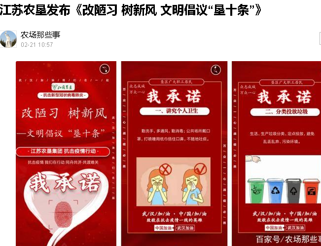 自江蘇農(nóng)墾集團制作的《改陋習 樹新風 文明倡議“墾十條”》我承諾抗擊新型冠軍狀病毒肺炎倡議書自發(fā)布以來,淮海農(nóng)場有限公司在多種網(wǎng)絡(luò)平臺上進行轉(zhuǎn)發(fā),并以此來作為抗擊疫情,以我們在行動,同舟共濟,共渡難關(guān)的硬核措施,其簡潔化的內(nèi)容,生動的畫面,便于傳播的動態(tài)展示,受到了農(nóng)場公司職工居民的紛紛點贊。