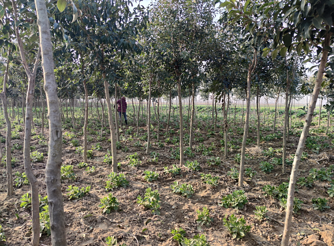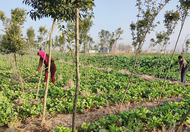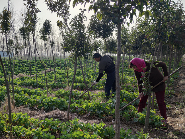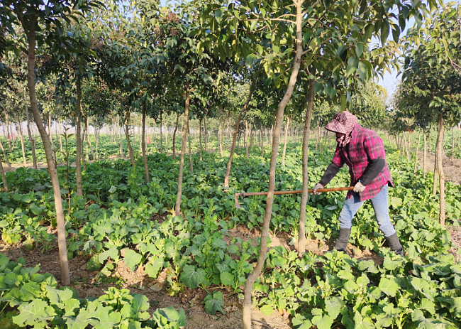 淮海農(nóng)場境內(nèi)有面積較大的林地面積,并且苗木長勢較好,成為農(nóng)場生態(tài)林地發(fā)展的一景。林木的發(fā)展,利益于農(nóng)場采取的集體林、股份林和承租林三種管理模式,因股份林和承租林一般由職工管理的林下經(jīng)濟發(fā)展的較好外,昨天下午,我們來到農(nóng)場五分場社區(qū)集體管護的林地間看到,其林下林邊的油菜、蠶豆等矮桿農(nóng)作物長勢正旺,農(nóng)業(yè)職工正在林下進行鋤草等農(nóng)事活動,給這個新春增添了一道忙碌的風(fēng)景。
