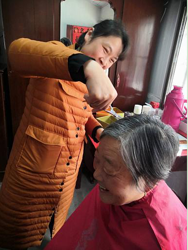 自新型冠狀病毒肺炎感染的疫情爆發以來,淮海農場職工、城西居委會志愿者沈月萍了解到振興小區有好幾個老年人無法外出理發或是擔心與外界親密接觸引起的心理恐慌等問題,于是她利用自己懂理發技藝這一潛質,應城西居委會幾位老人的要求,帶著理發工具,逐門逐戶地親自上門為老年人修剪頭發,其親切的服務態度,免費為老人服務的鏡頭,贏得了城西居民們的普遍贊譽!圖為志愿者沈月萍正為老人凌愛珍修剪頭發時的鏡頭。
