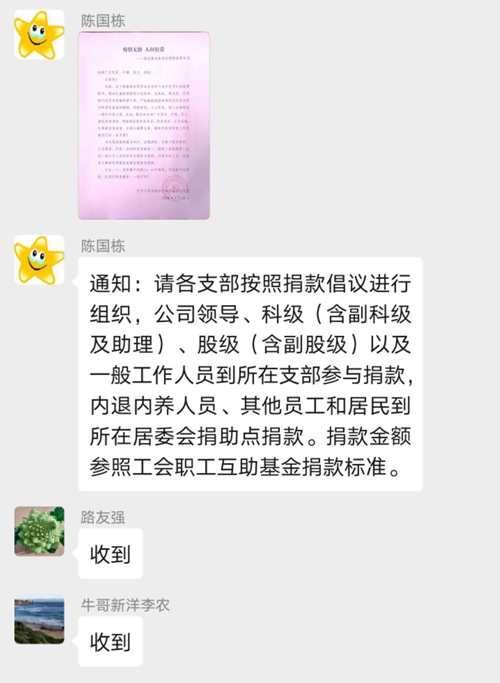 “疫情無情 人間有愛 ——新冠肺炎疫情防控捐款倡議書,全場(chǎng)廣大黨員、干部、員工、居民:大家好!當(dāng)前,為了積極響應(yīng)黨中央號(hào)召和習(xí)近平總書記的重要指示,堅(jiān)決打贏疫情防控人民戰(zhàn)爭、總體戰(zhàn)、阻擊戰(zhàn)……”。2月28日,新洋廣播電臺(tái)分時(shí)段播放捐款倡議書,與此同時(shí),新洋支部書記群、各單位微信工作群也在積極轉(zhuǎn)發(fā)倡議書,號(hào)召全場(chǎng)上下積極捐款支援抗疫,得到了一致響應(yīng)。