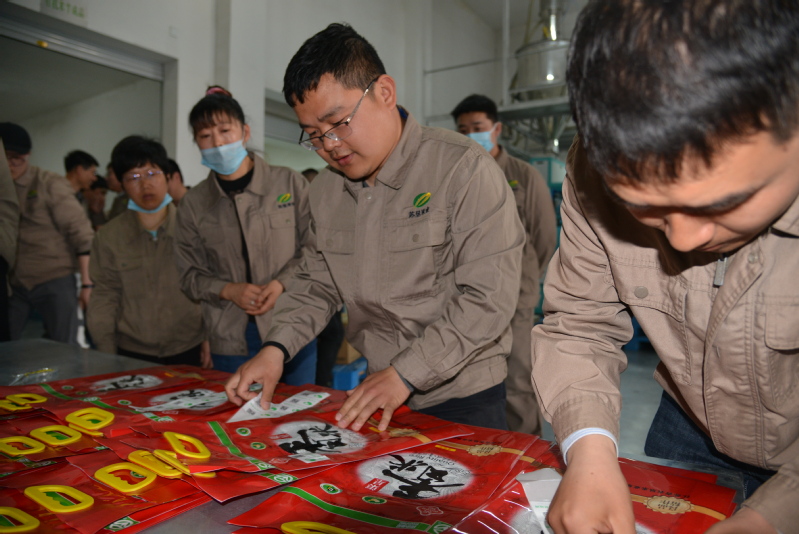 隨后,淮海米業(yè)副總經理程愛華向大家介紹了米業(yè)公司的具體情況以及義工活動的相關內容。在米業(yè)公司的精心安排以及幾位操作師傅的悉心指導下,青年員工“義工行”活動有序開展。青年員工們親自動手,認認真真、標標準準地完成了包裝袋、紙箱(盒)噴碼作業(yè)、貼追溯碼等標簽、大米包裝熱合、成品米外觀自檢驗以及成米裝箱封口、轉至成品區(qū)這樣一套完整的過程。為了增強活動效果,還穿插了小組競賽,活動既讓大家體驗了勞動的快樂,又培養(yǎng)了大家團結協(xié)作、勇往直前的精神。