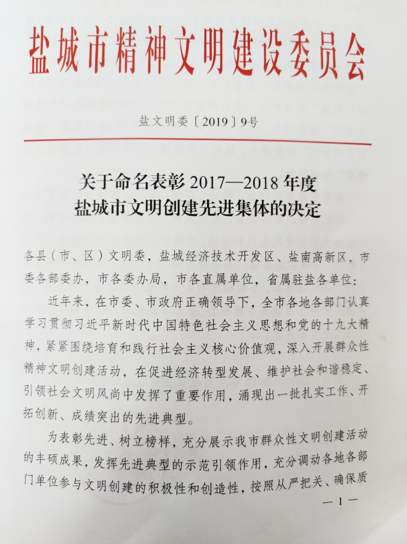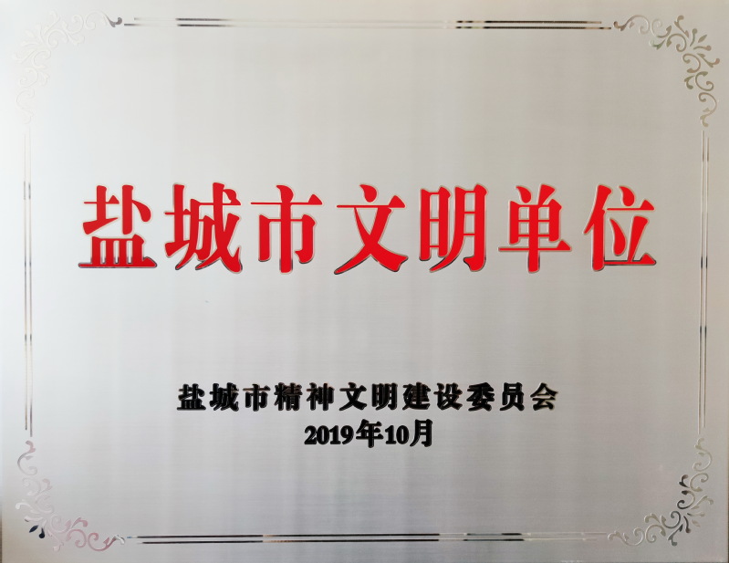 淮海收到江蘇省和鹽城市“文明單位”獎牌