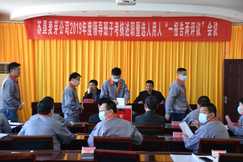 根據集團黨委《關于做好2019年度企業領導班子和領導人員年度考核及選人用人“一報告兩評議”工作的通知》要求,5月7日上午,蘇墾麥芽公司召開2019年度領導班子考核述職暨選人用人“一報告兩評議”會議。集團公司考核組王玉強等出席會議,公司經營層班子、中層助理以上管理人員參加了會議,會議由公司黨委書記、董事長、總經理郭世平主持。