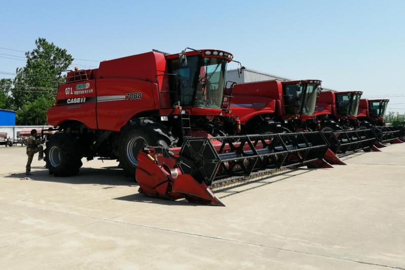 圖為農機總站機駕人員正在對凱斯7088聯合收割機進行最后的維護和保養