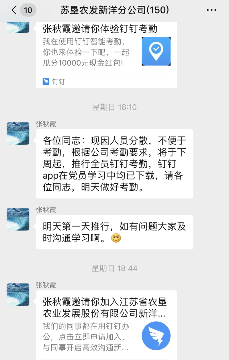 “‘三夏’大忙期間因人員分散,不便于考勤,根據公司要求,下周起推行全員‘釘釘’考勤,請各位同志積極做好考勤工作?!苯?,蘇墾農發新洋分公司微信工作群內發布了一則關于加強“釘釘”考勤的通知。