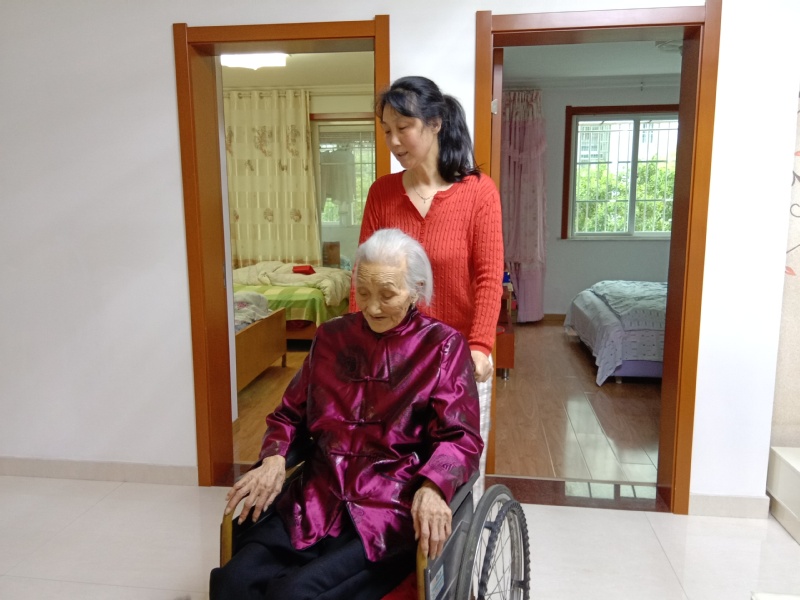 丁吉女在90歲那年,一次她在上廁所跨籬笆時,右腿跌斷了,在家床上躺了好一陣子。到了98歲那年,一次早上下床時,腳被褲子拌了一下,從床上栽了下來,又造成了右大腿骨骨折,至此,她便臥床不起,在輪到二女兒周粉英陪護時,她就擱張床睡在老媽媽旁邊,方便夜里照顧老人,把老太照料得干干凈凈,鄰居無人不夸這個孝順的女兒。