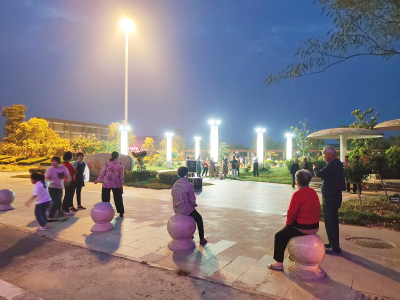 隨著夏季的來臨,每當人們吃完晚飯,在淮海農場淮海公園內就是別樣的風景。這時晚霞余輝西下,夜幕降臨,公園內變幻的燈光閃爍,色彩斑斕,讓公園內的綠植、設施和燈光融合在一起,非常漂亮。