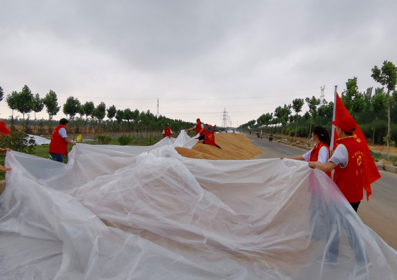6月9日,崗埠上空突然烏云密布,下午更是刮起涼風(fēng),隨時可能會下雨,攤曬在場面上的小麥面臨受潮威脅。考慮包莊生產(chǎn)區(qū)糧食大多在路面晾曬,分布廣、戰(zhàn)線長,為防止糧食遭雨,黨員志愿服務(wù)隊及時動員機關(guān)黨員志愿者協(xié)助生產(chǎn)區(qū)搶場。