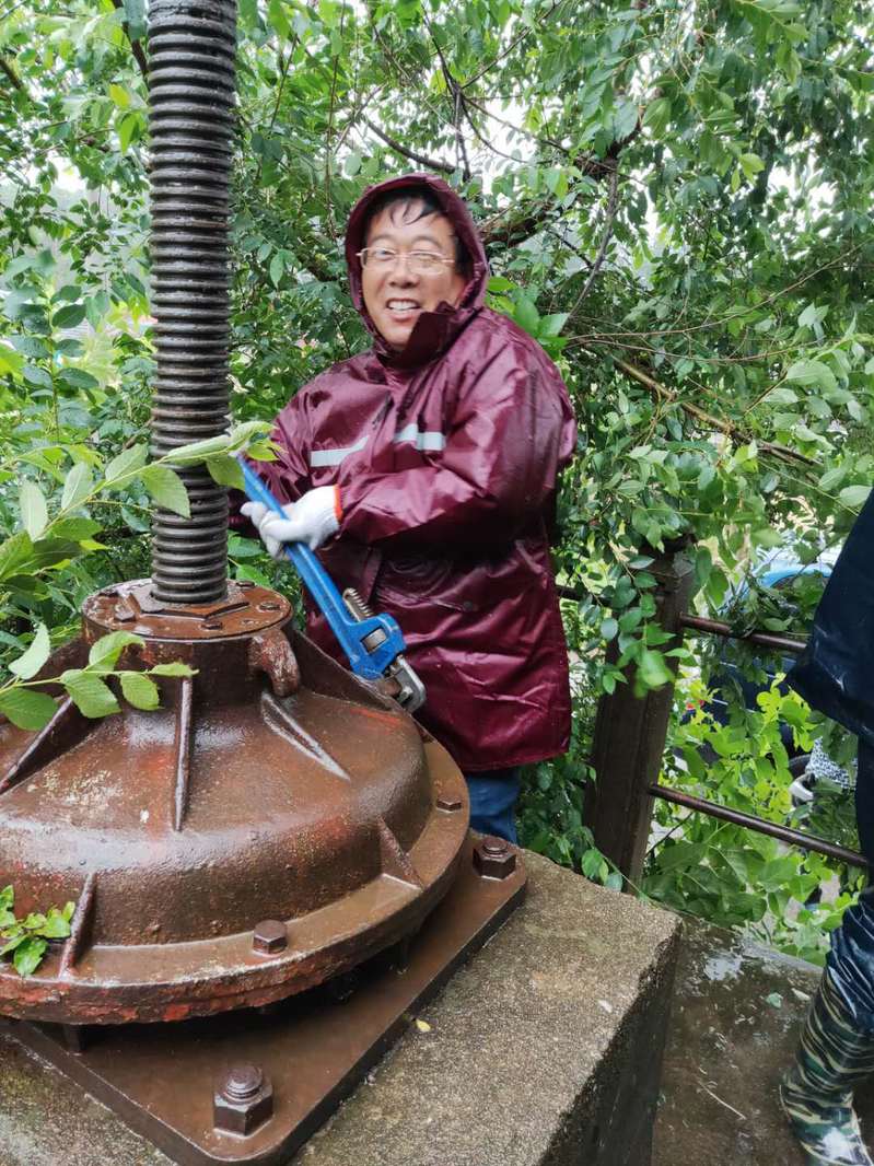 7人中有5人是農發二支部的黨員同志,當他們冒雨趕到小木閘,發現要升起一大二小三個閘門只有靠人力一圈一圈的轉動升降螺桿時,沒有多余話語,立即分工合作。何成就、萬罡、李少金三人用管子鉗轉動兩個小閘門的螺桿,徐揚、王光軼、周旭明、陳中頂四人合力用撬杠轉動中間的大閘門。閘門大而沉重,只有減速機的高轉速比才能通過人力轉動小齒輪帶動大閘門。經過估算,大約轉動200圈閘門升起2cm,要想閘門完全升起離開水面大約需要提升2m的高度,這就大約需要轉20000轉,所以四個人輪流上陣轉動小齒輪,一刻不停,就這樣從早上8點轉到下午4.30,終于將大閘門升離水面。小閘門也是同理,三個人輪換,一個人累了就換下一個。7人從早上7點接到命令,一直干到下午4.30終于完成泄洪任務。看著升離水面的閘門,看著漸漸下降的水位,7個人雖然累的手抬都抬不起來,但是心中有滿滿的成就感。