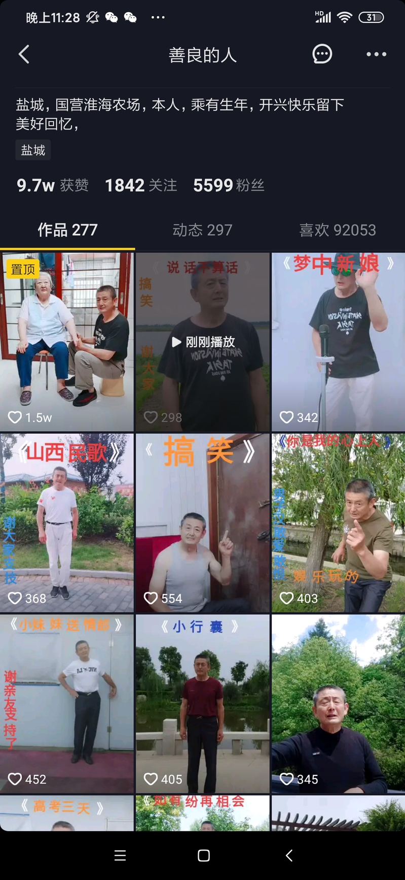近年來,在淮海農場社區,有一個網名叫做善良的人拍攝的短視頻在抖音平臺上廣泛傳播,獲得了數萬網友的點贊和評論,仔細一看,這位擁有大量粉絲和數萬點贊量的“網紅”,居然是淮海農場城東居委會才退休的職工吳建龍,他制作的抖音持續被農場職工居民所關注,在他的首頁簽名上,寫有“鹽城,國營淮海農場,本人,乘有生年,開心快樂留下美好記憶”的留言,到現在為止,他共發布作品277件、動態297條,作品獲贊9.7萬次,獲得1843人關注,并有粉絲5600有之多。